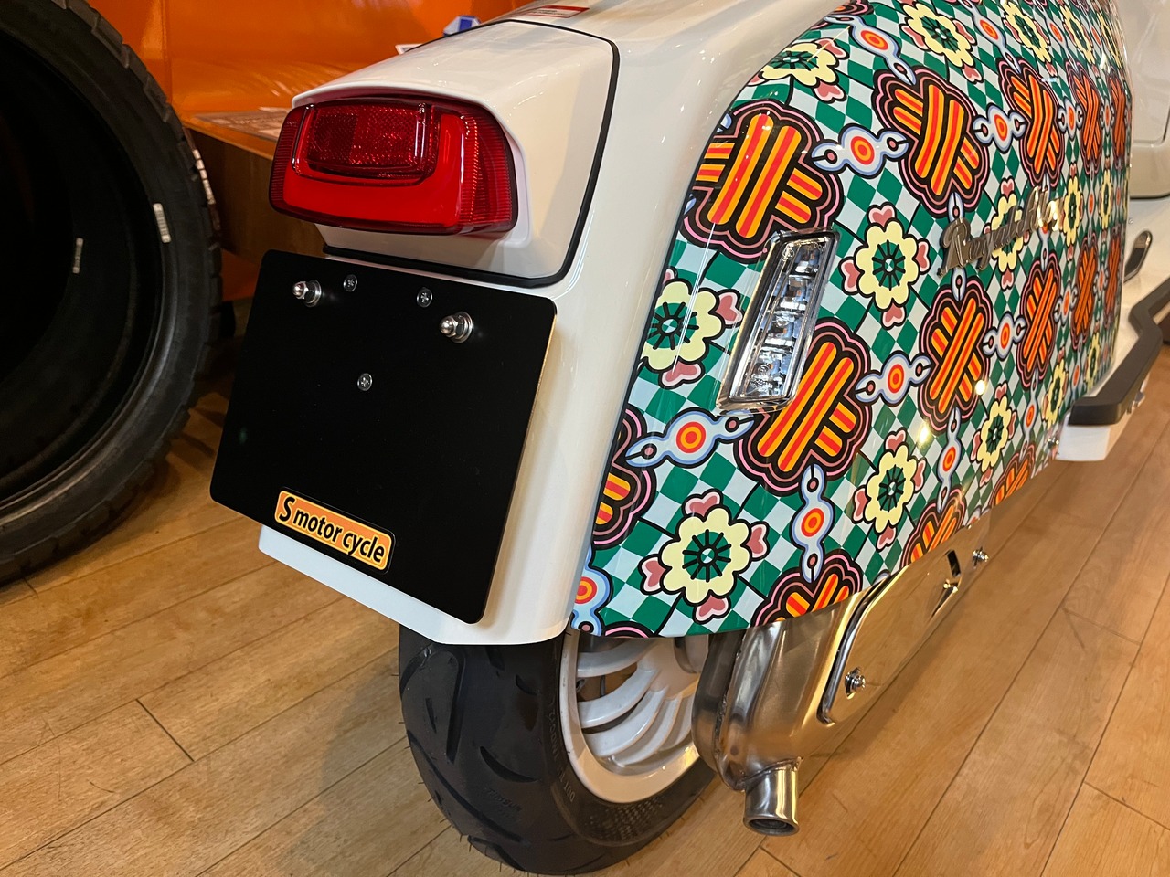 ナンバープレート下に余白が有りますので、お好きなステッカーを貼るもよし、当店の反射ステッカーを貼るもよし、ゴム製マッドガードを取り付けるために穴を空けるもよし…です。